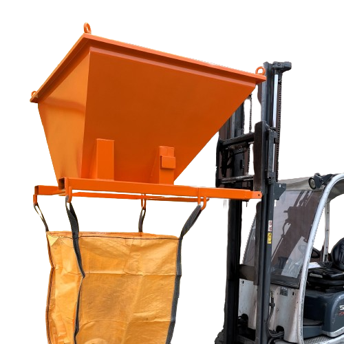 TRAMOGGIA A IMBUTO INFORCABILE PER BIG BAG BG 1069 Struttura in acciaio ad imbuto con sedi forche per sollevamento Larghezza bocca d'ingresso cm 160 x 120 Larghezza bocca ingresso sacco cm 68 x 67